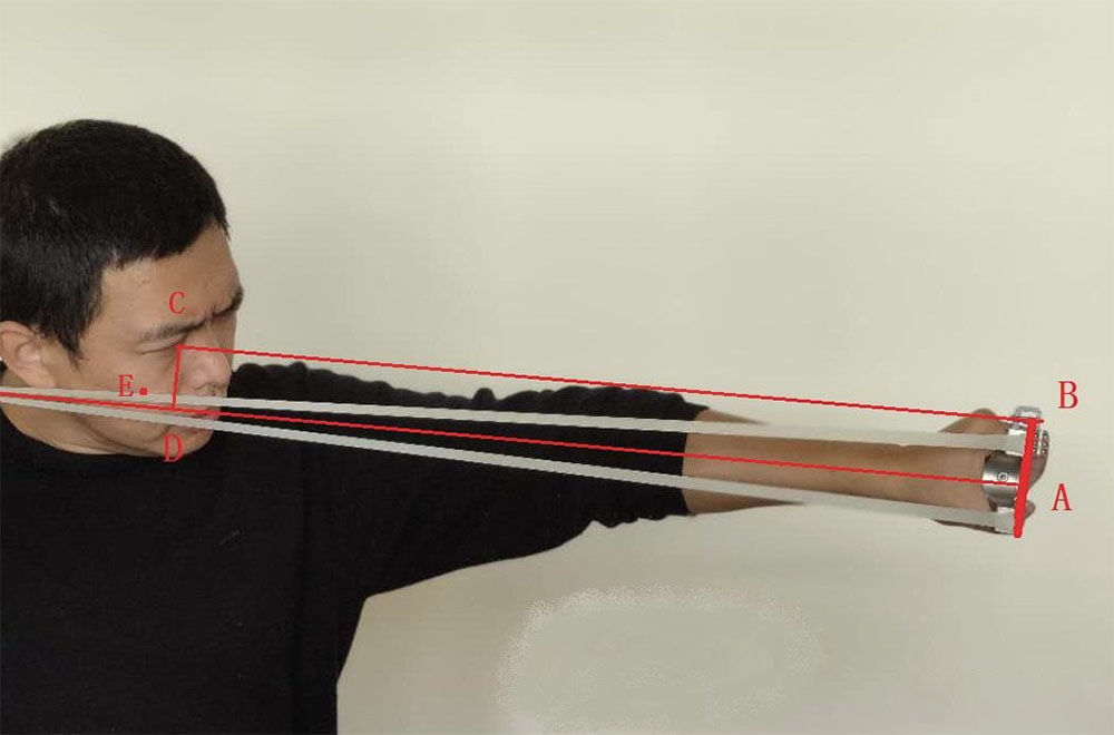 Để đảm bảo độ chính xác cho súng cao su, cần cố gắng làm sao để mỗi lần ngắm, đường thẳng CB và AD luôn giữ cùng một góc kẹp, hoặc nói cách khác, đảm bảo khoảng cách từ đồng tử (điểm C) đến đường thẳng AD là không đổi. Tuy nhiên, khi ngắm chúng ta không có cách nào cảm nhận chính xác khoảng cách này, chỉ có thể thông qua việc cảm nhận điểm tiếp xúc E giữa dây thun và gò má để xác định vị trí của đường thẳng AD.