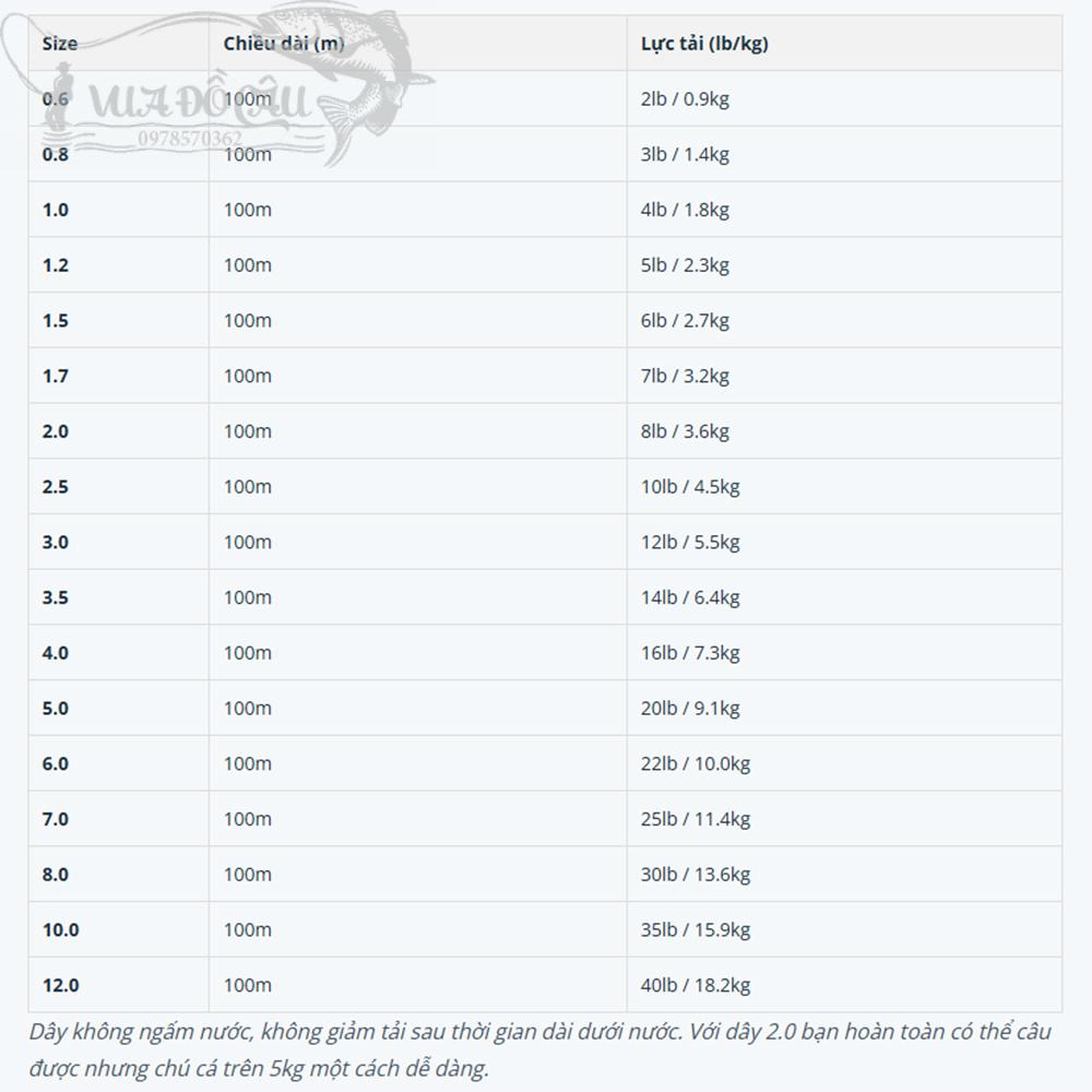 Dây không ngấm nước, không giảm tải sau thời gian dài dưới nước. Với dây 2.0 bạn hoàn toàn có thể câu được nhưng chú cá trên 5kg một cách dễ dàng.